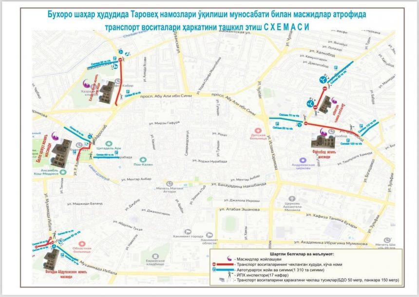 Рамазон ҳайити намози муносабати билан 20 март куни соат 00.00 дан 08:00 гача қуйидаги масжидлар ва уларга туташ кўчаларда транспорт воситаларининг ҳаракати вақтинча чекланади